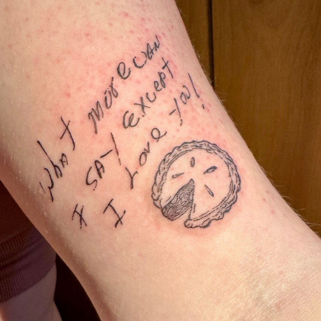 View fullsize Grandpa’s handwriting, including all the smudges from the ballpoint pen and a pie like he used to make :’)